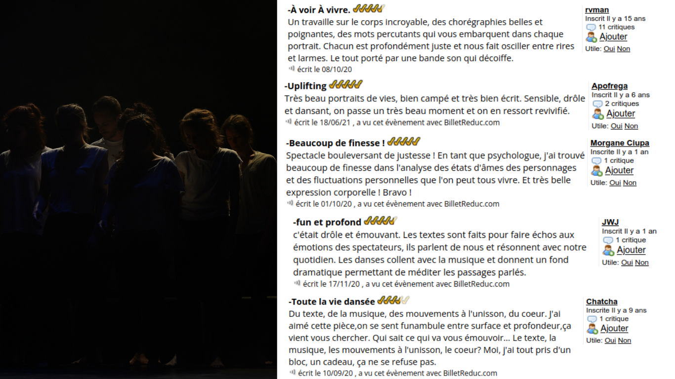 Cette pièce raconte la vie, la vraie, avec ses failles, ses forces, ses moments de joie et de tristesse. Les personnages nous parlent d’eux et à travers leurs récits, il parle de quelque chose d'universelle. Les textes nous questionne sur notre rapport à nos pensées, notre vécu, elle nous invite à réfléchir à nos comportements