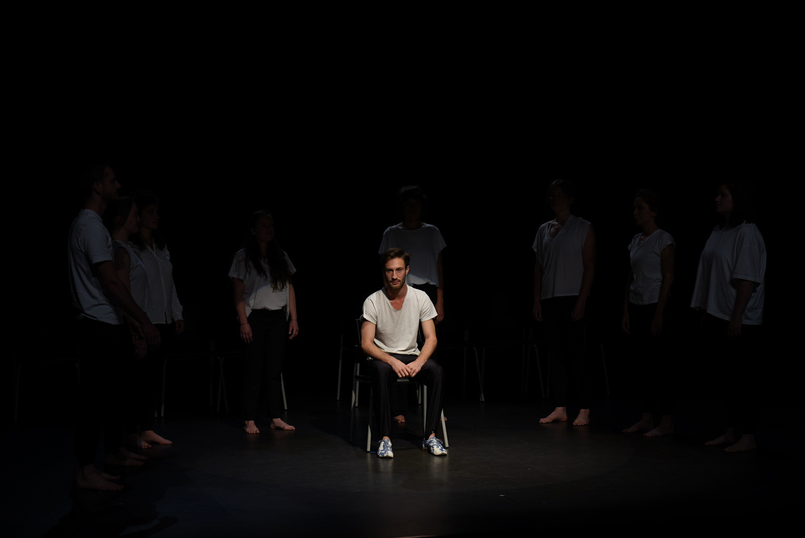coulisses côté jardin et cour / Fond de scène noir / Le spectacle se joue en frontal.